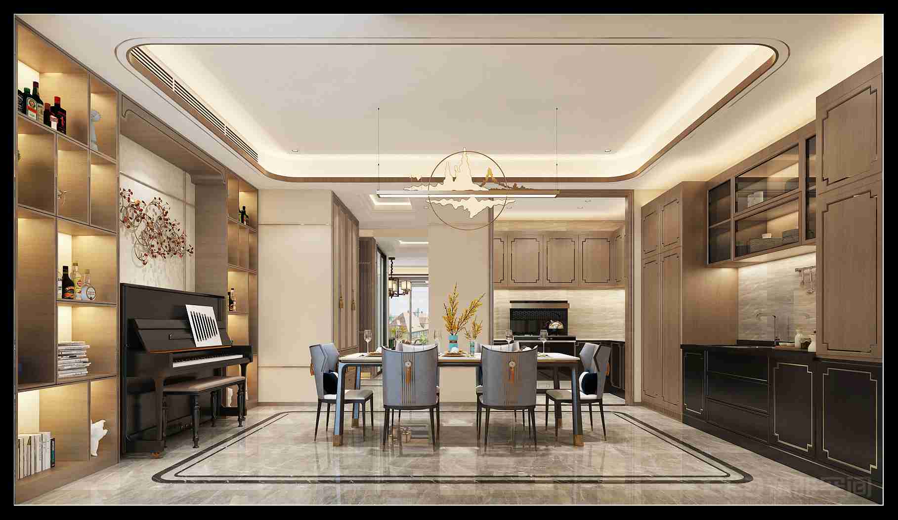 凸显仪式感和尊贵感的超长双横厅空间,奢华的尺度是本案最为重要的空间亮点。捕捉到这个优势,设计师强调中式审美特点之一:对称性。以过道为中轴,客厅、办公区、餐厅、西式吧台安然落座,确保整体视野广阔,空间方寸毫不浪费且功能极为融合。